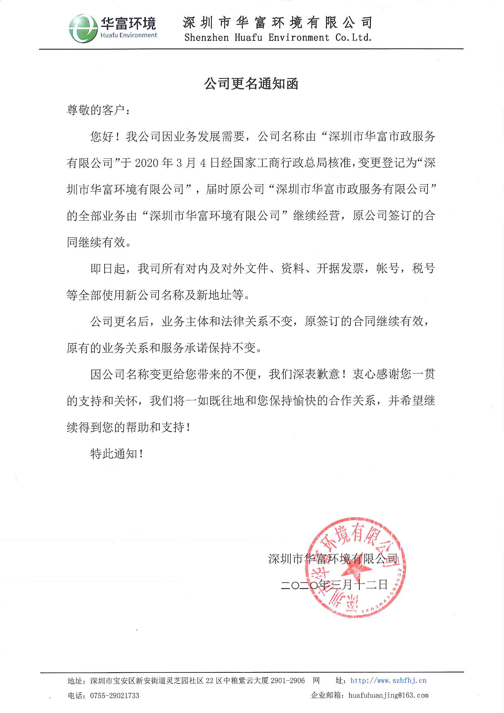 您好!我公司因业务发展需要,公司名称由“深圳市丝瓜视频入口在线播放市政服务有限公司”于2020年3月4日经国家工商行政总局核准,变更登记为“深圳市丝瓜视频入口在线播放环境有限公司”,届时原公司“深圳市丝瓜视频入口在线播放市政服务有限公司”的全部业务由“深圳市丝瓜视频入口在线播放环境有限公司”继续经营,原公司签订的合同继续有效。