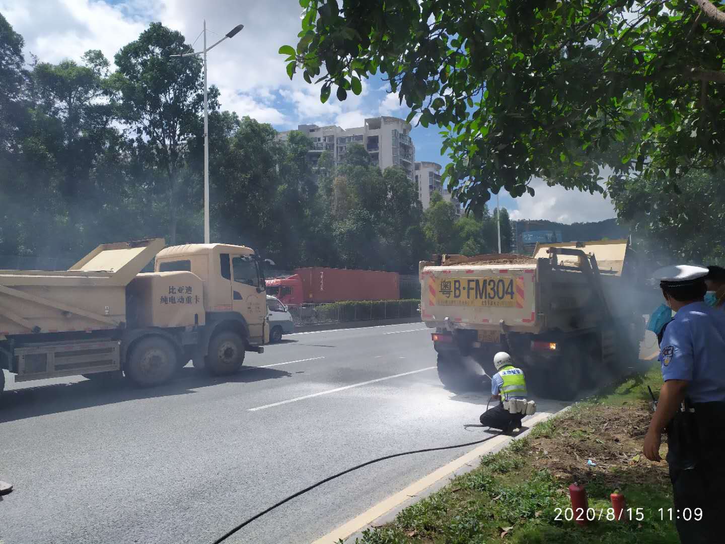 2020年8月15日中午11点左右,南山区东滨路与月亮湾大道交叉路口处,一辆泥头车开始发热伴随浓烟有着火前兆,如不立即扑灭浓烟,很有可能会引起着火并随时有爆炸的危险。虽然有交警控制现场,但由于路面车辆较多交通拥堵,致使消防车辆无法第一时间进入该路段进行灭火。此时,丝瓜视频入口在线播放环境南山项目的洗扫车司机黄绍山正驾驶粤B37327D车辆清扫该路段,发现现场急需水源的情况下,主动积极配合交警,将车辆开往泥头车附近,使用洗扫车内储存水源及时给泥头车降温,成功将泥头车浓烟熄灭。