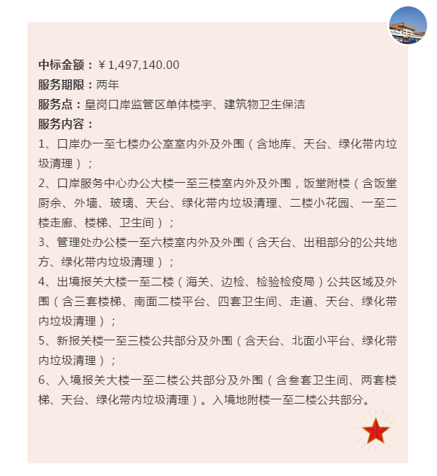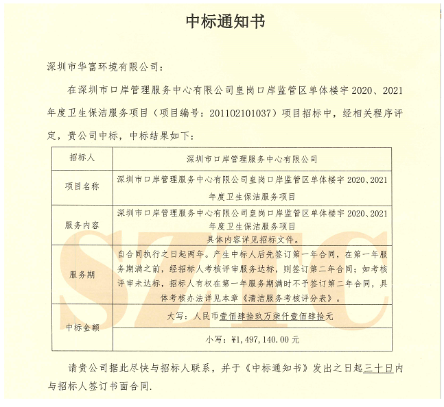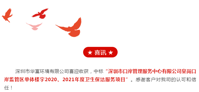 喜讯 | 丝瓜视频入口在线播放环境中标“深圳市口岸管理服务中心有限公司皇岗口岸监管区单体楼宇2020、2021年度卫生保洁服务项目”