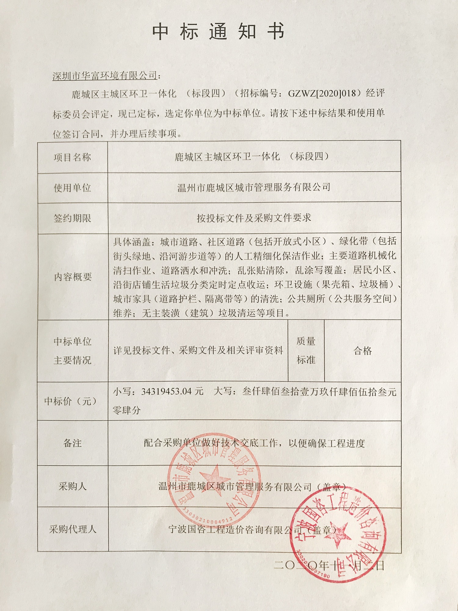 市场部传来中标喜讯,我司中标浙江省温州市“鹿城区主城区环卫一体化(标段四)”项目。这无疑是对公司的综合实力,技术水平和公司团队凝聚力的又一次肯定。