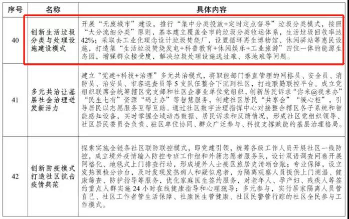 开展"无废城市"建设,推行"集中分类投放+定时定点督导"垃圾分类模式,按照创新生活垃圾"大分流细分类"原则,基本建立覆盖全市的拉圾分类收运体系,生活拉圾回收率达分类与处理设42%;采取去工业化理念设计垃圾焚烧厂,设置循环再生博物馆、休闲驿站等惠民设施建设模式施,打造集"生活垃圾焚烧发电+科普教育+休闲娱乐+工业旅游"四位一体的能源生态园,增强群众接受度,解决垃圾处理设施选址难、落地难等问题。