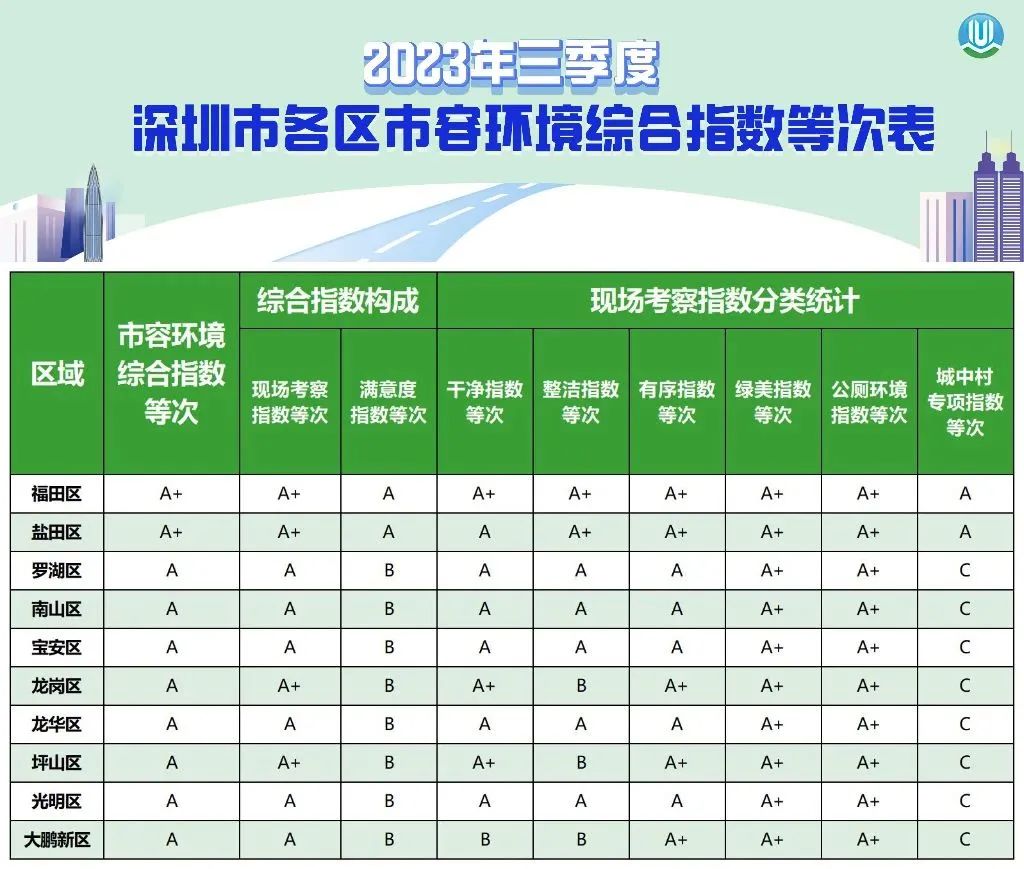 10月10日,深圳市城市管理和综合执法局发布2023年三季度深圳市市容环境综合指数测评结果。三季度,全市市容环境综合指数为92.46,其中现场考察指数为92.83,满意度指数为89.19。